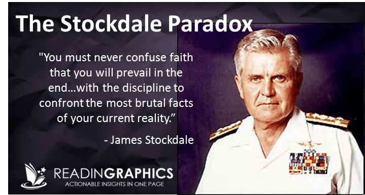 The story comes out in Jim Collins’ book Good to Great. In the book, Collins and the admiral are taking a walk together, and the admiral says, “I never doubted not only that I would get out, but also that I would prevail in the end and turn the experience into the defining event of my life, which, in retrospect, I would not trade.”