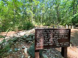 Many of you may know the famous passage from Walden inscribed on the sign at Walden Pond itself. Thoreau writes: “I went to the woods because I wished to live deliberately, to front only the essential facts of life, and see if I could not learn what it had to teach, and not, when I came to die, discover that I had not lived.”